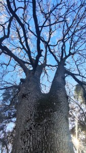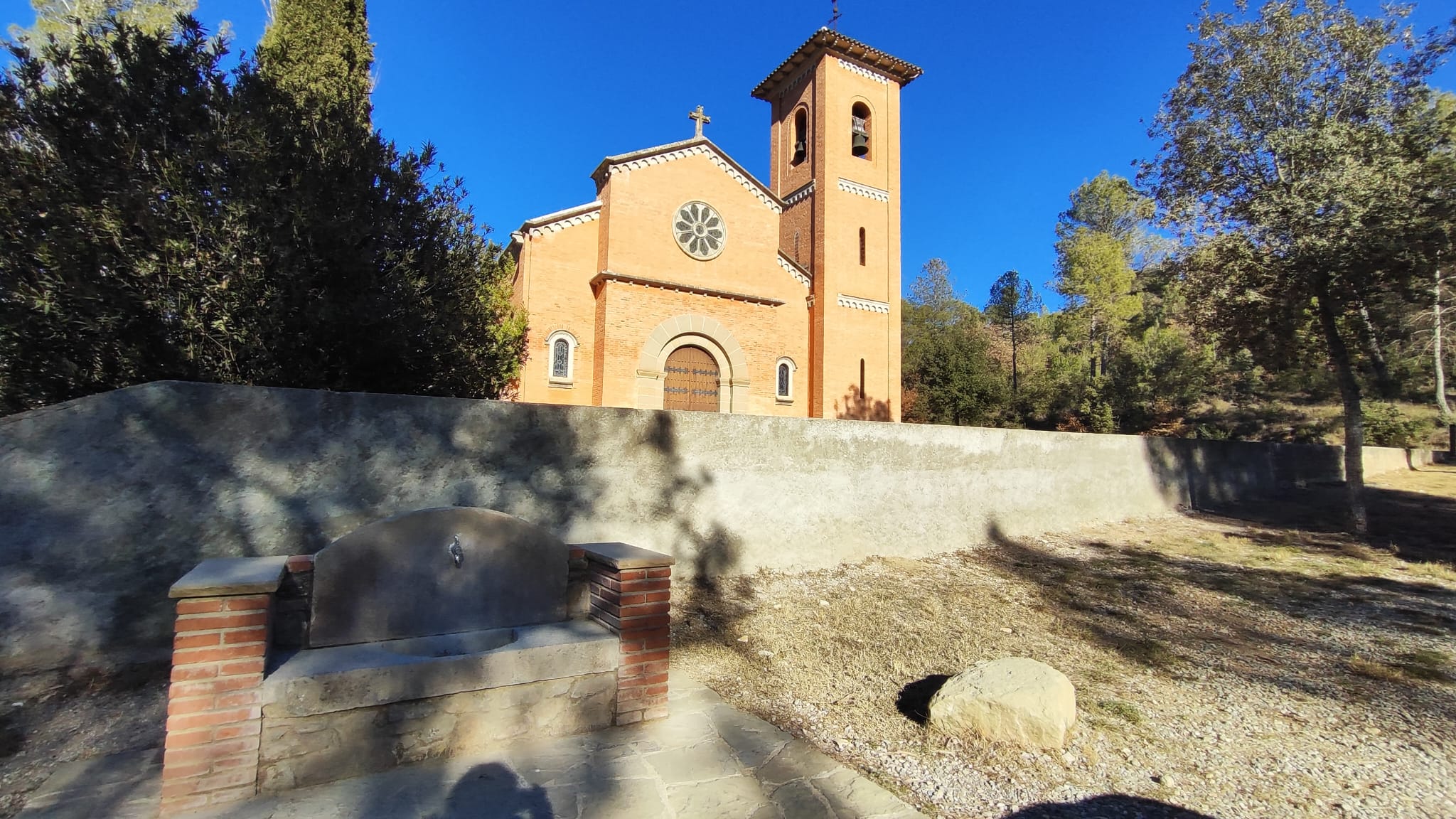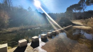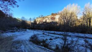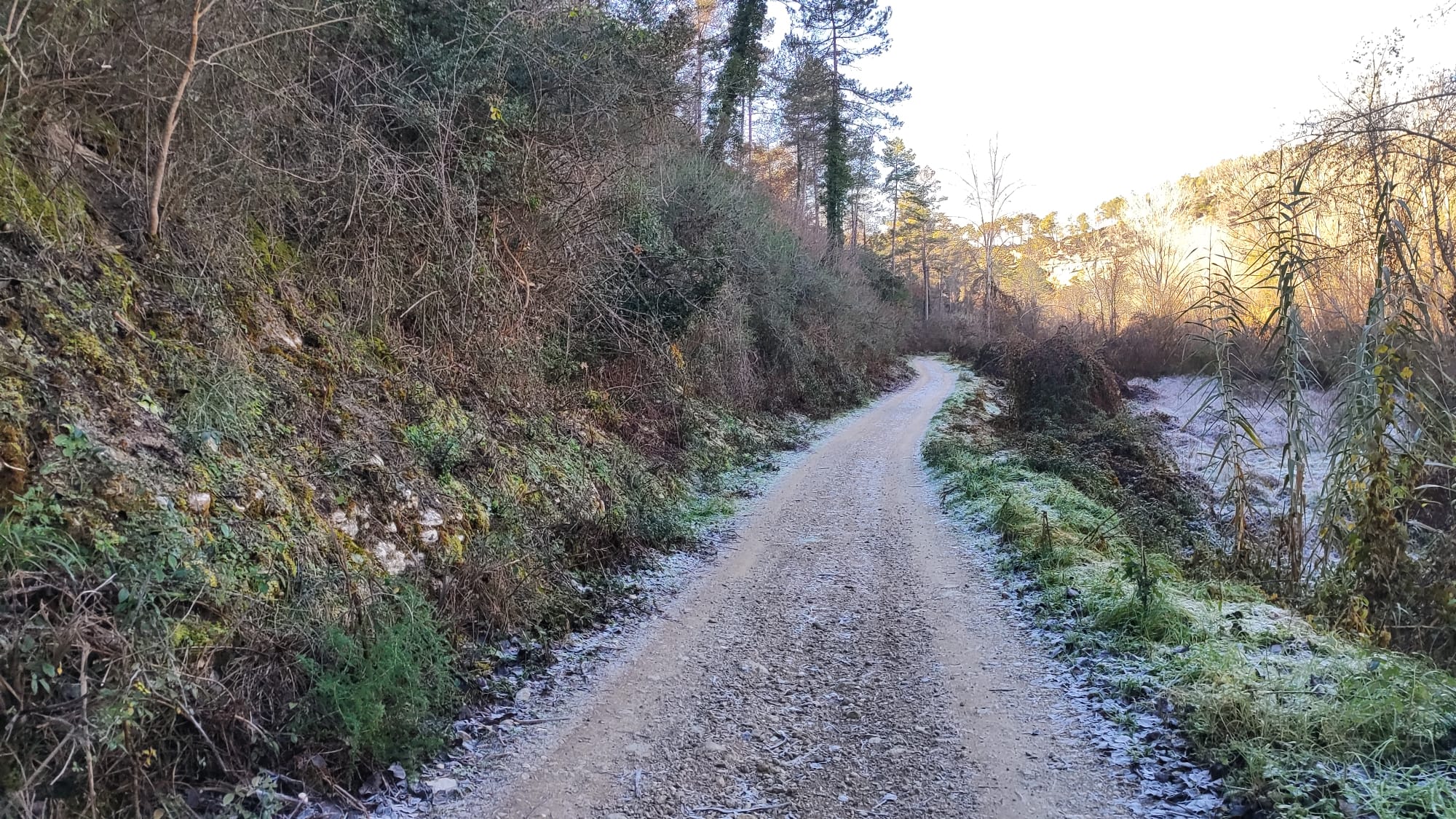 Camino per la pista en la qual de la qual surt el corriol que du a la fonteta i ara que és hivern fins i tot a migdia el sol és molt baix, i depèn de cap a on fas camí t’enlluerna. Transito per la pista forestal estreta i els prats i herbassars dels costats estan gebrats. Fa fred per aquí, sobretot a l’ombra. Passo per la Colònia Jorba, que és a l’altra banda del riu. A prop hi ha un gual amb verns, però fa fresqueta i no m’animo a baixar al riu. Necessito arribar a Sant Pere, on hi ha l’església nova que va substituir la destruïda del Llucià.