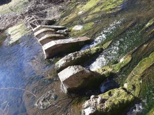 D’aquest espai vaig a petar a un altre gual on molt a prop hi ha una mena de represa. Fa uns anys passava pels graons de la represa a l’altra banda perquè el gual baixava amb prou aigua per a obligar-me a descalçar. Ara ja no és així; algunes motos van passar per la represa i van esvalotar la bardissa i, per contra, al pas on m’havia de descalçar el riu és més baix i, per tant, és practicable saltant per les pedres.
