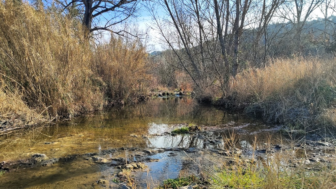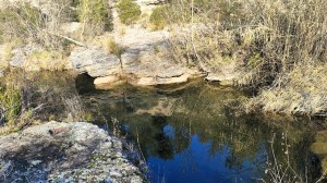 Un cop travesso el gual segueixo una mica el riu i vaig a unes petites banyeres on m’havia remullat altres primaveres. La clau era fer-ho entre que acabava el fred i que naixien els crancs de riu. El terreny d’aquest riu és calcari i dona closca als crancs, i més o menys quan s’apropa estiu comencen a aparèixer arreu. Llavors fa calor, però el riu està més baix i és farcit d’aquesta gent. Ells no tenen gens d’interès a barallar-se amb mi, però sempre pot ocórrer un accident i les picades són de mal pronòstic.