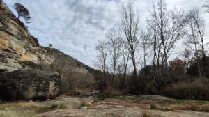 A prop hi ha uns blocs de pedra molt espectaculars i la roca amb la veta de quars que tant m’agrada contemplar. Els pollancres fan galeria i el riu segueix amunt una mica amagat entre la vegetació. Aviat arribo a una esplanada que en temps més humits fa un prat en el qual a la primavera moltes múries, cardots i xicoires hi fan comunitat. Més endavant a la dreta hi ha un grup de salzes que gaudeixen de bona salut i semblen expandir-se per aquesta part del riu amb el seu sistema de clonació.