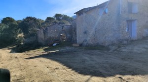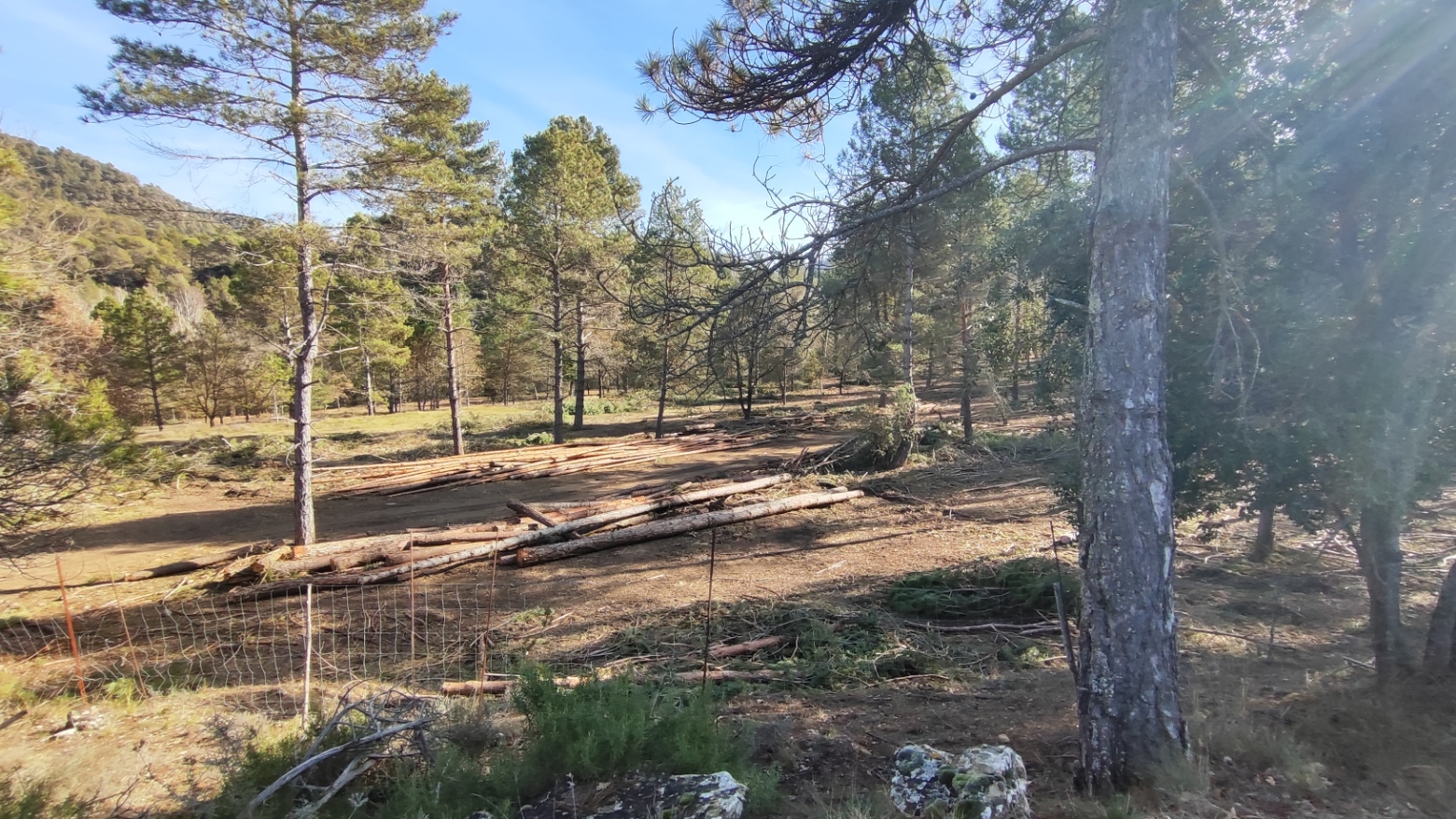 A poc a poc arribo al trencant on la pista pot anar o bé a Marfà o seguir cap a La Datzira. Hi ha uns rètols que prohibeixen el trànsit de vehicles rodats cap a La Datzira i indicacions de zona de seguretat en la qual la cacera és prohibida. Em semblen mesures encertades. Passo per un espai on han talat pins i hi ha molts troncs agrupats i al cap de poc arribo a la casa.