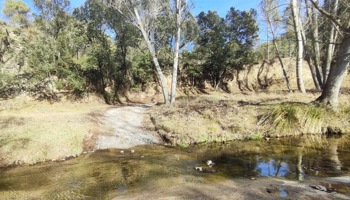 Venien cistelles de menjar ecològic i es podien recollir a Moià i em vaig fer clienta. No sé si la gent encara és la mateixa, però fa l’efecte que la filosofia sí. En passar a prop de la porta hi ha la remor d’un generador encès, però no surten ni gossos ni persones. Creuo l’era de davant la casa i segueixo cap al meandre. Em fa il·lusió ser aquí. Em semble un lloc remot. De fet, és al bell mig entre Moià i Monistrol. Arribo al meandre i al gual que travessa cap a Moià. Aquí m’havia perdut algunes vegades a la tardor i m’agradava ficar-me per dins un bosquet ple d’aurons que hi havia al costat de la riera.