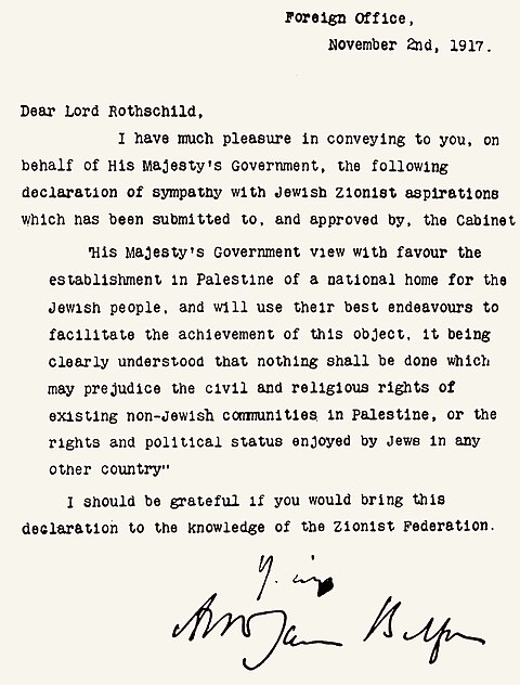 “El Gobierno de Su Majestad contempla con beneplácito el establecimiento en Palestina de un hogar nacional para el pueblo judío y hará uso de sus mejores esfuerzos para facilitar la realización de este objetivo, entendiéndose claramente que no se hará nada que pueda perjudicar los derechos civiles y religiosos de las comunidades no judías existentes en Palestina, o los derechos y el estatus político de los judíos en cualquier otro país.