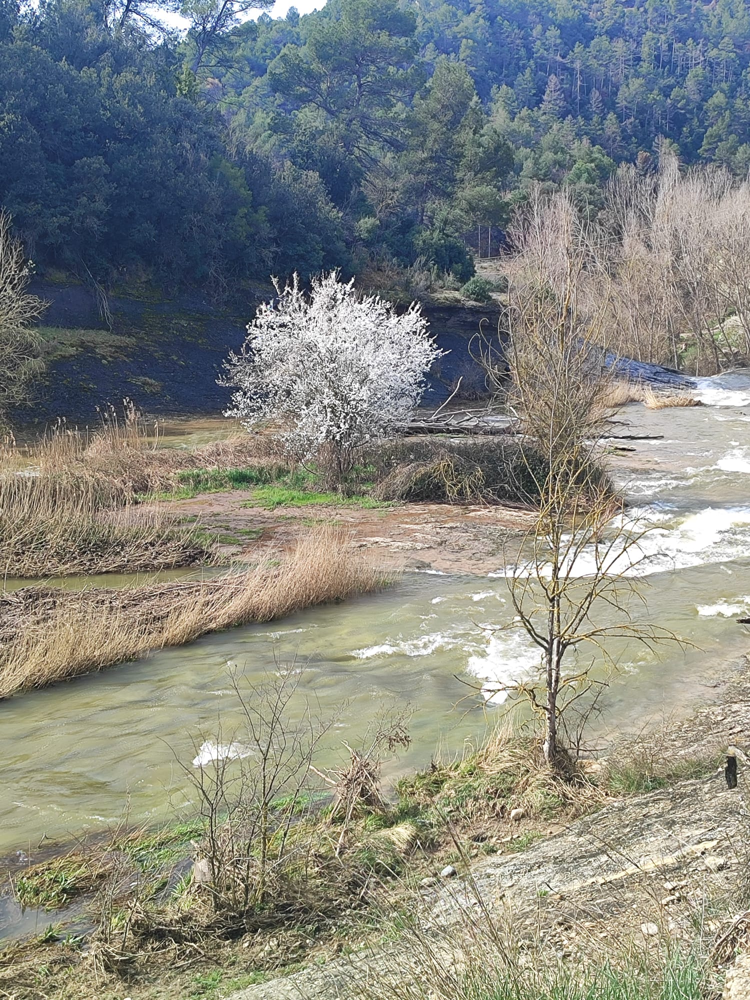 Arribo al gual dels cabirols i el riu baixa molt ple. Baixo a la llera i intento creuar, però no m’atreveixo. Hi ha punts en els quals les botes katiuskes em quedarien cobertes i a més a més no veig bé el fons. Hi ha un arbre preciós a l’illa dels salzes i volia donar-li una ullada. Està florit, pot ser un prunyoner o alguna rosàcia. Les seves floretes blanques petites són nombroses i enmig de la verdor i amb l’aigua argentada de fons exposa una imatge metafísica. He de desistir. Avui no podré accedir a aquest arbre tan atractiu.